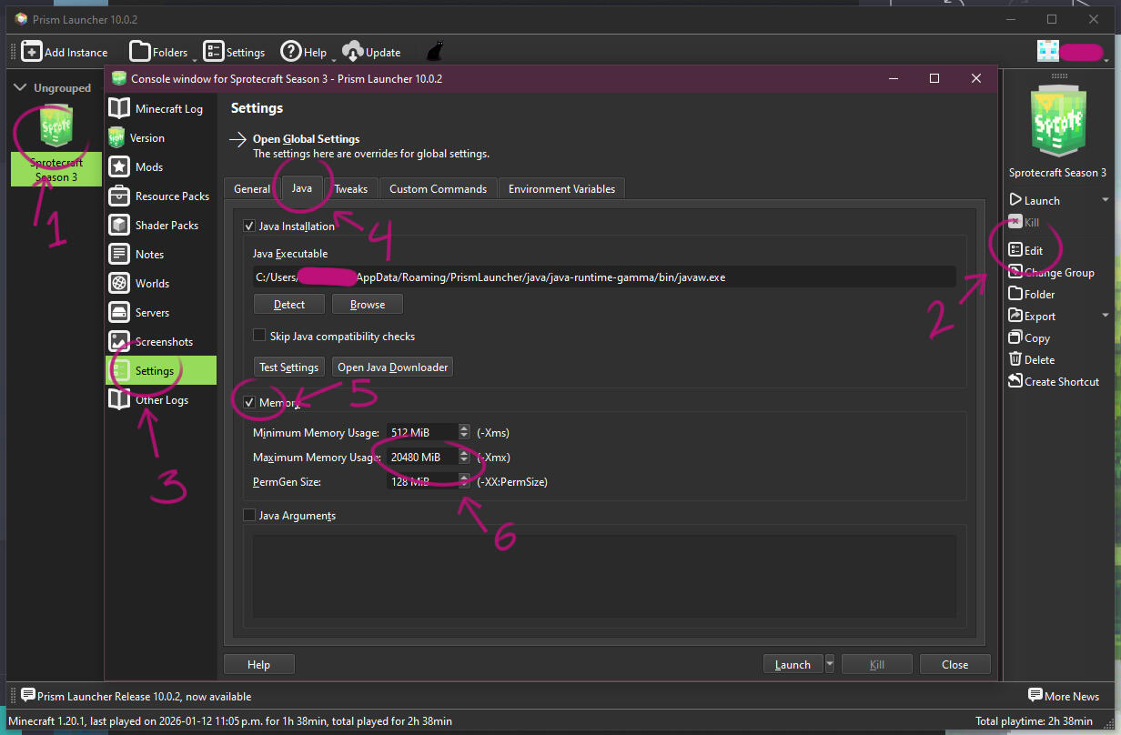 Each instance in Prism Launcher has it's own RAM parameters, which means we will have to allocate more ram so that it can run this modpack.To do this, click the Sprotecraft icon, and on the right side panel select "edit". In the new window, Select settings, then the Java tab, enable the "Memory" checkbox.Allocate at least 10GB (~10000 MiB) of memory.If you are unable to see these options, you may need to download 64-bit Java.