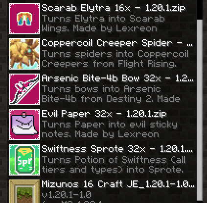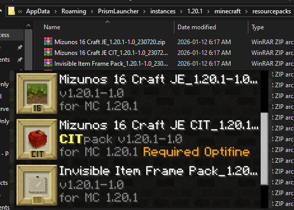 Download Mizuno's 16 Craft along with it's CIT counterpart and Invisible Item Frame.Once downloaded, open Sprotecraft root directory by clicking the folder icon on the right panel in Prism Launcher.In the file explorer window, navigate to the "minecraft" folder. Drag 'n' drop the resource packs you've downloaded into the resourcepacks folder.When in game, you will see a tab called "Options..." in the ESC menu. Click it and then select the "Resource Packs...". Move over the three Mizuno's packs to the right side in the order as seen in the image.When it is finalized, your game will load the new textures in. This will take a bit of time.
